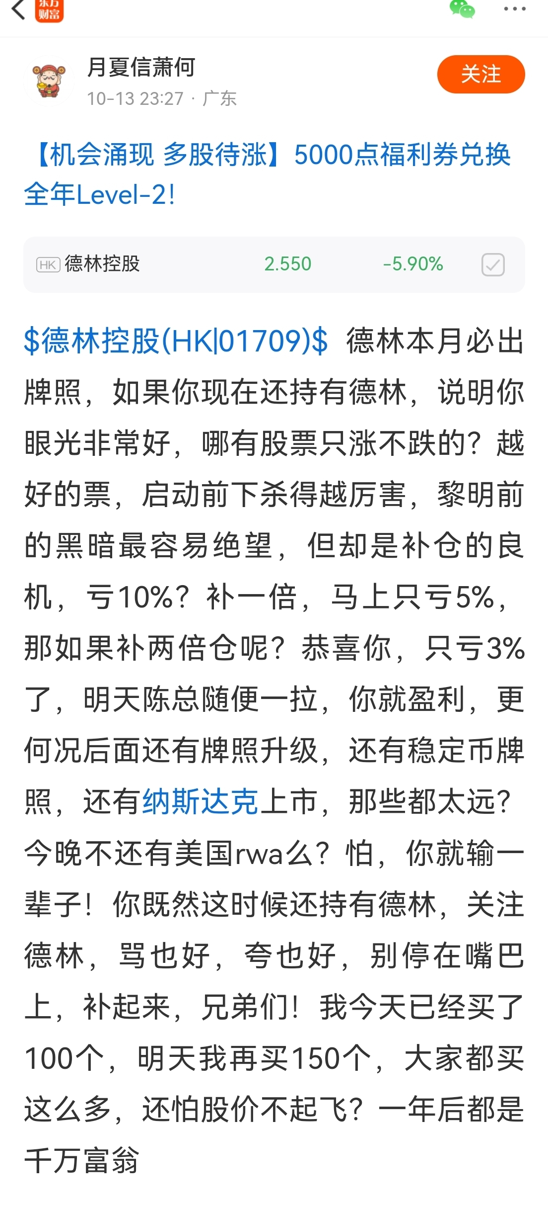 月苟从10月13号开始号召大家买,来了个180度大转弯,这是几个意思?现实版的无间道?3.1到2.5,百分之20的跌幅,这又是咋回事呢?难不成是月苟这样有着巨额资金的黑手在做空德林?月苟出来解释一下。