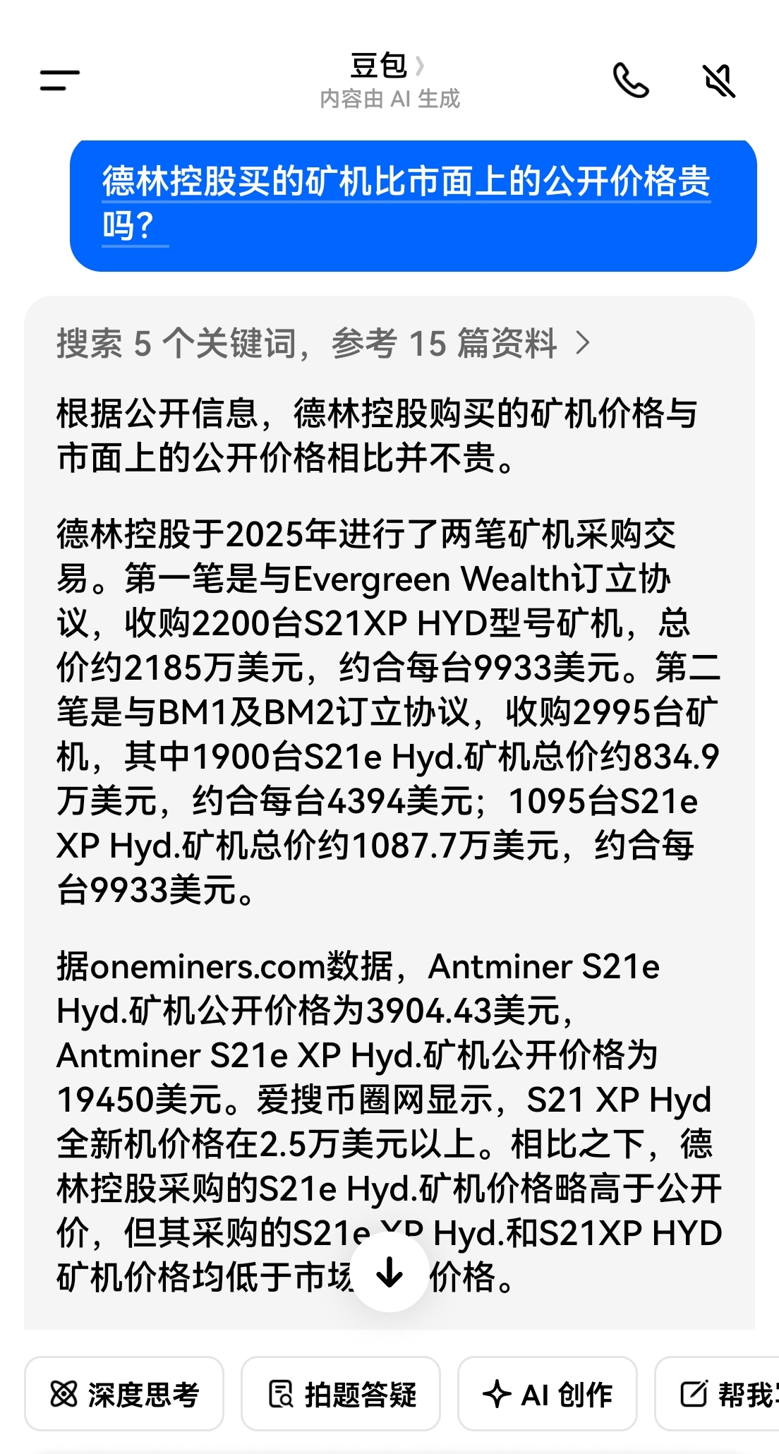 同样是豆包,我搜的关于德林矿机价格的怎么就属公允价呢?