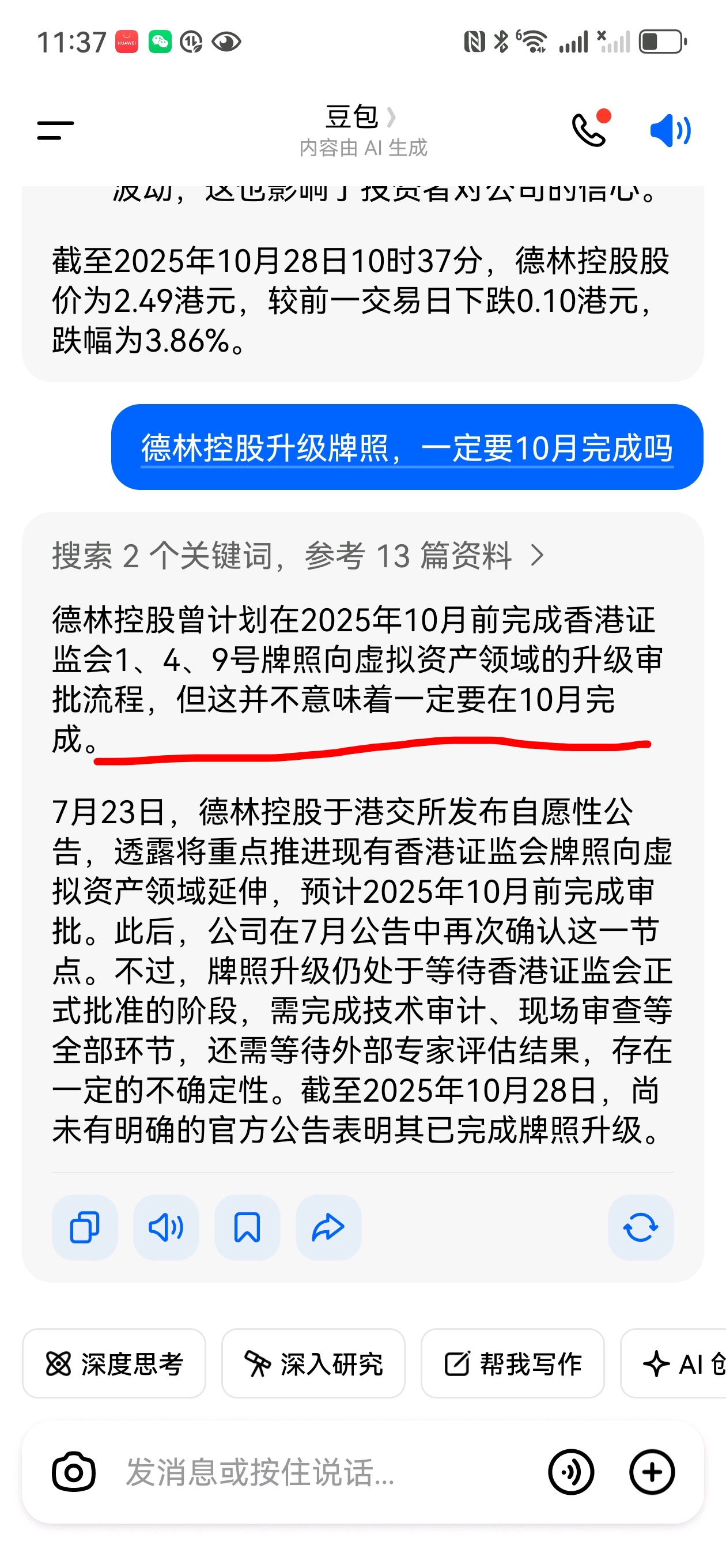$德林控股(HK|01709)$ 不晓得什么情况,亏了30个点,10月完成只是公司预期,不一定会一定是10月?天天跌,希望公司出来公告一下进展!