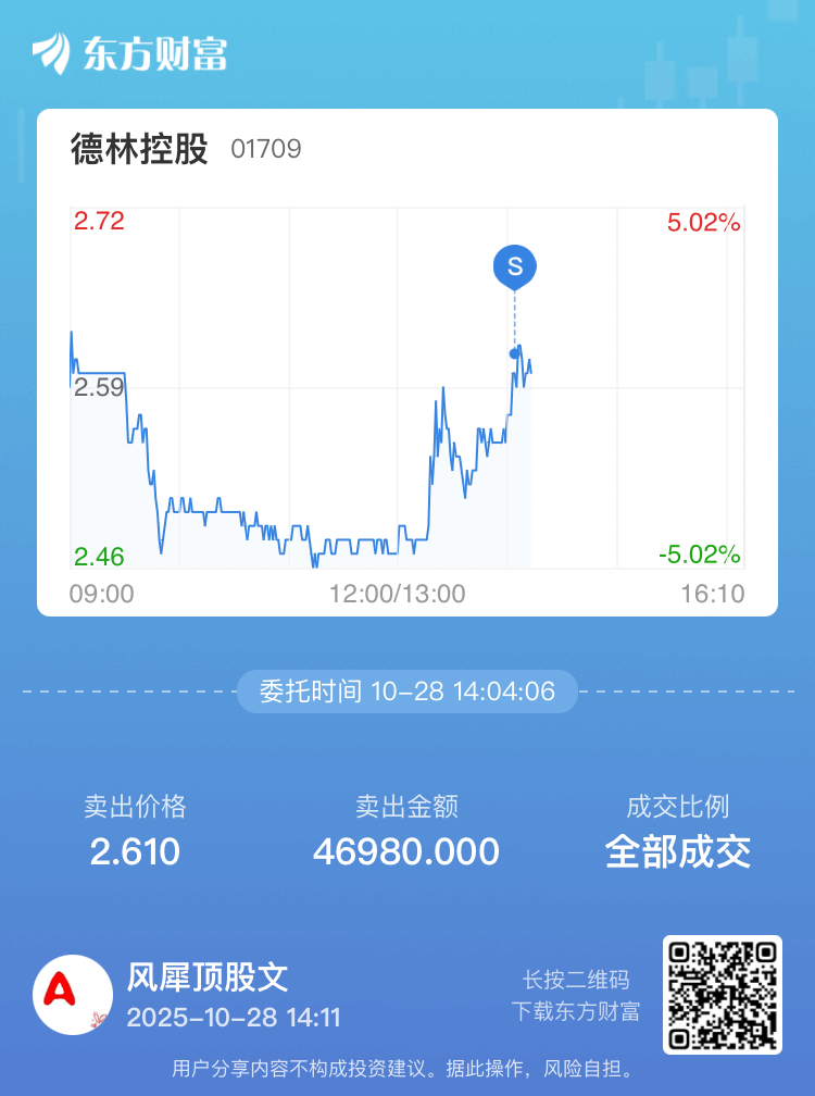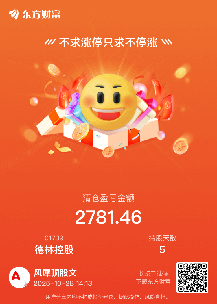 $德林控股(HK|01709)$ 今天T加零了一次,收益够一桌菜了。留下来的继续发财。