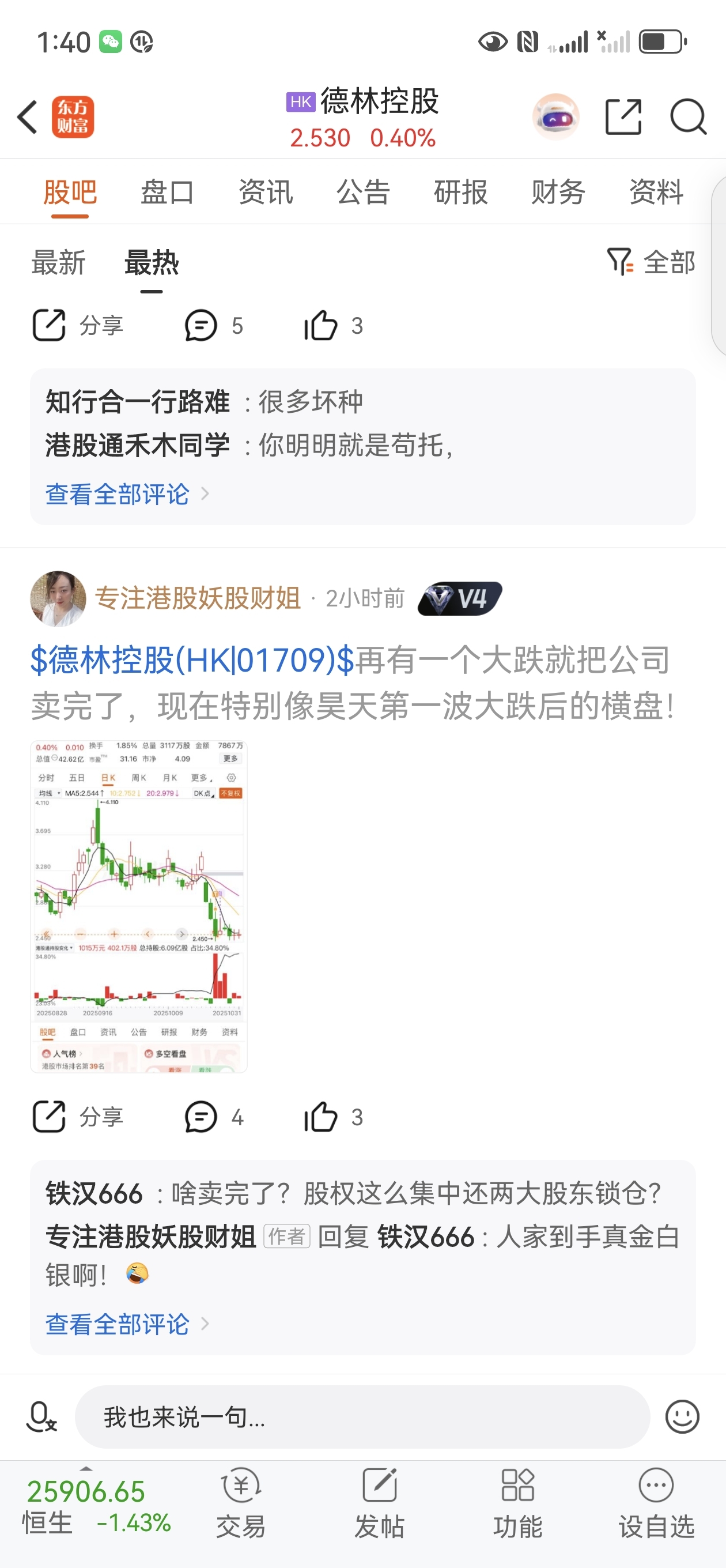 $德林控股(HK|01709)$ 德林控股加油,所有人都不看好你,骂你是老千股~希望董事长多拿出来一些诚意!不要辜负了支持你的股民~短期跌跌撞撞真的无所谓,只要不是为了骗钱…有因必有果!熟话说多行不义必自毙!