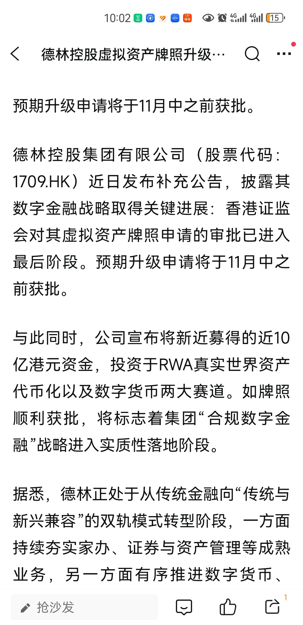 $德林控股(HK|01709)$ 升级牌照,11月中或批。