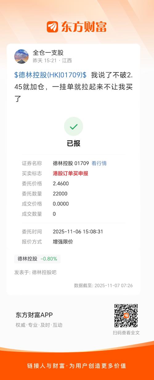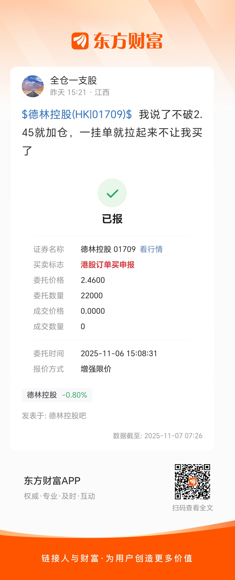 $德林控股(HK|01709)$  我说了不破2.45就加仓,一挂单就拉起来不让我买了