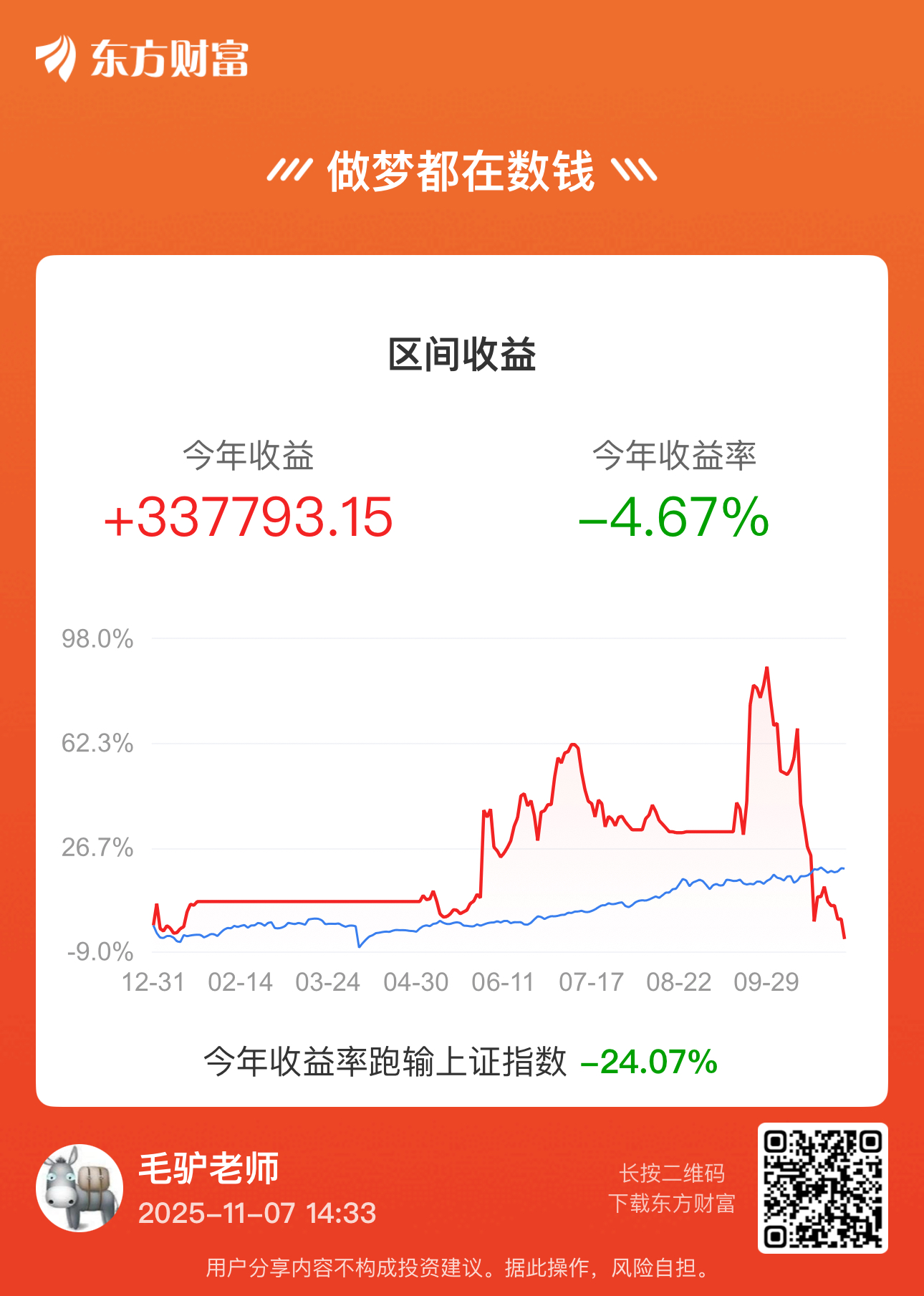 头皮发麻啊,今年最高88%的收益率,一个月能跌成负数了。还好老师前面把本金提现出
