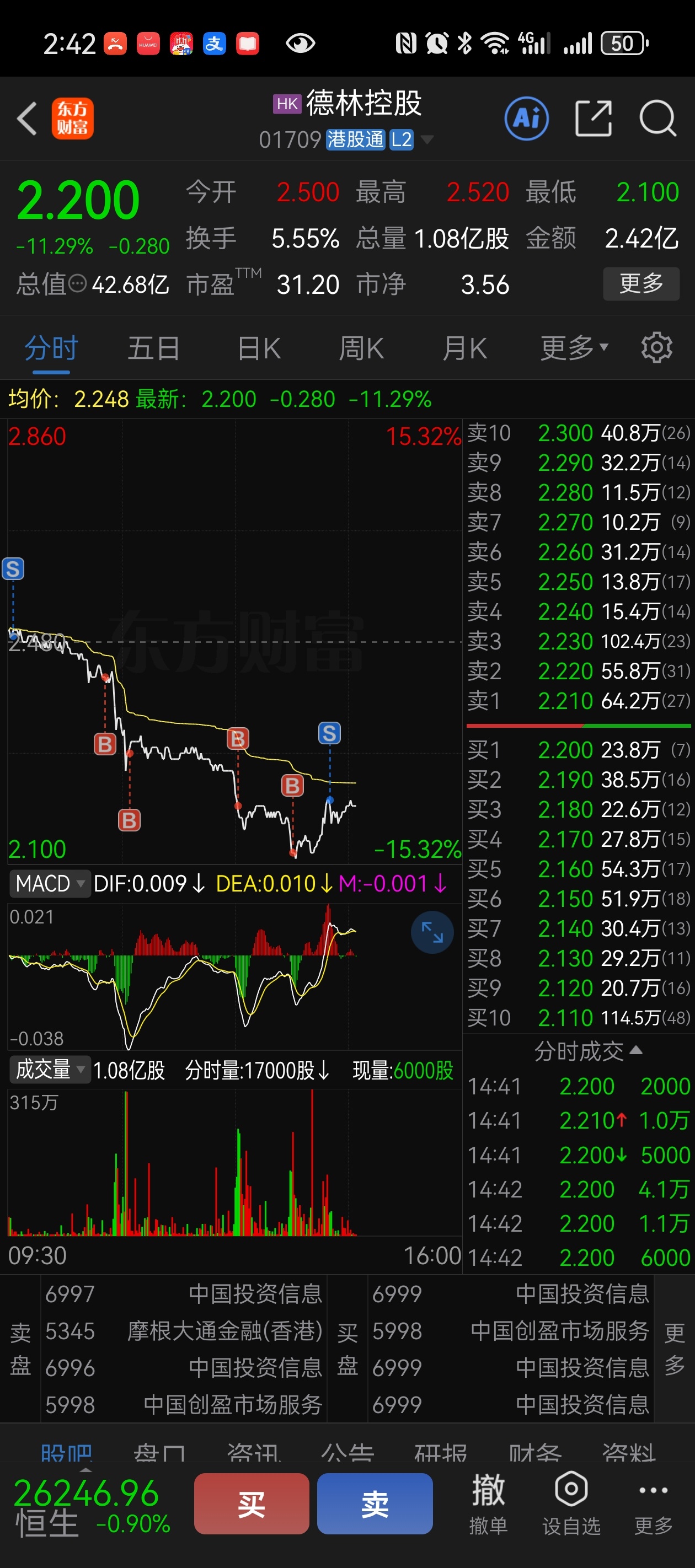 $德林控股(HK|01709)$ 卖了又买,多出1万股,还是把2.12买的1万股在2.21先套出去了,虽然舍不得卖,但也不敢盲目增大港股仓位,必须把控风险