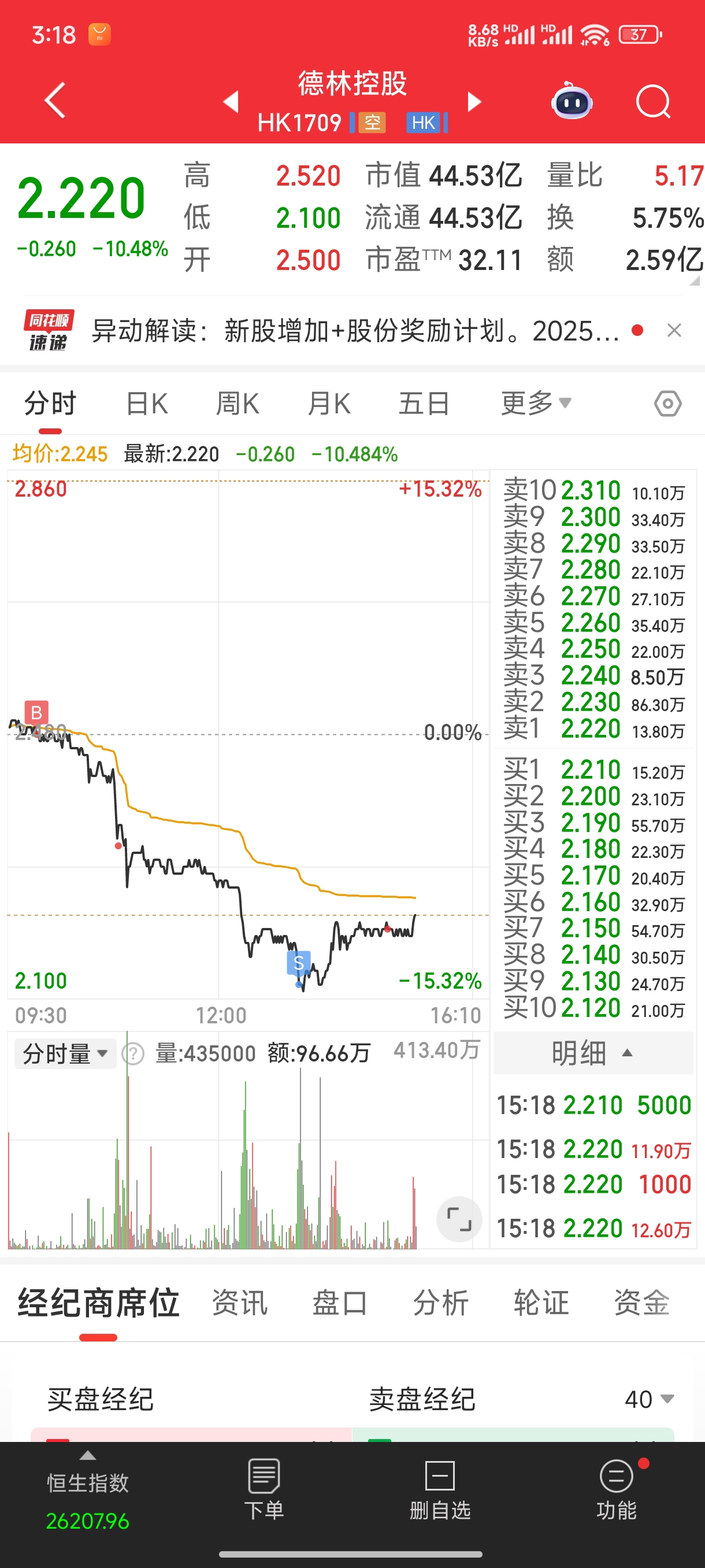 苟股!最低点2.12割肉了,又不跌了。还好出去昊天赚了一点回来,结果看到德林公众