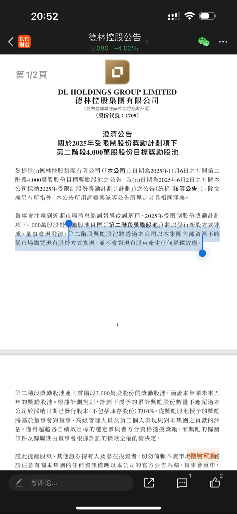 $德林控股(HK|01709)$ 今天定海神针之后现在定心丸来了,德林昨天公告没写清楚,所以引起市场误解,不是发新股,是从市场上按照市价收4000万股老股。小小补仓了一点