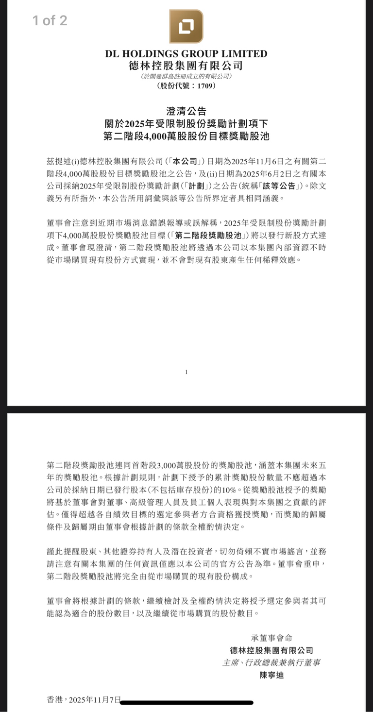 $德林控股(HK|01709)$ 利空出尽,拨乱反正「今天定海神针之后现在定心丸来了,德林昨天公告没写清楚,所以引起市场误解,不是发新股,是从市场上按照市价收4000万股老股。」