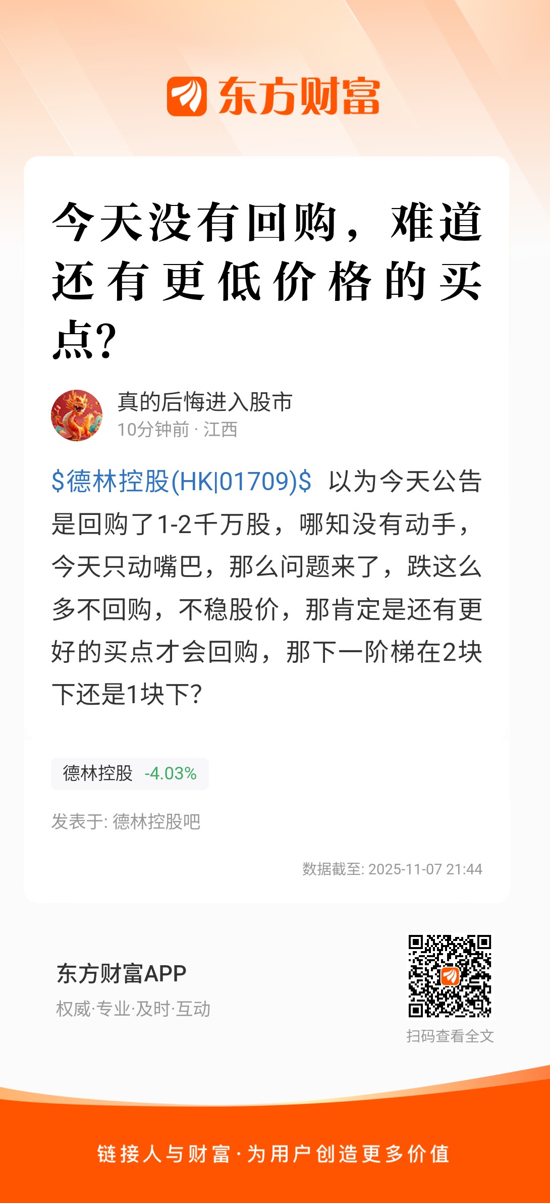 $德林控股(HK|01709)$ 以为今天公告是回购了1-2千万股,哪知没有动手,今天只动嘴巴,那么问题来了,跌这么多不回购,不稳股价,那肯定是还有更好的买点才会回购,那下一阶梯在2块下还是1块下?