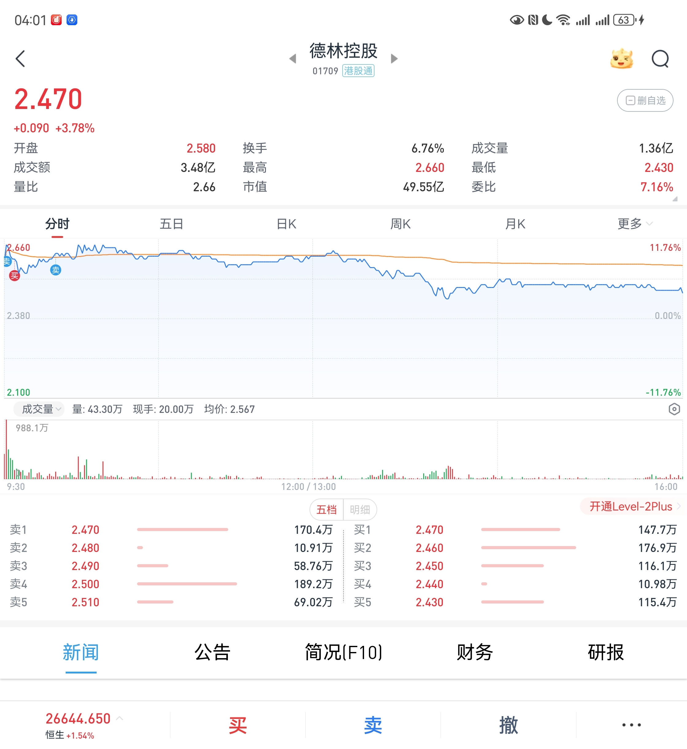$德林控股(HK|01709)$ 这种只能吃点水钱就跑。2.65,2.62出。