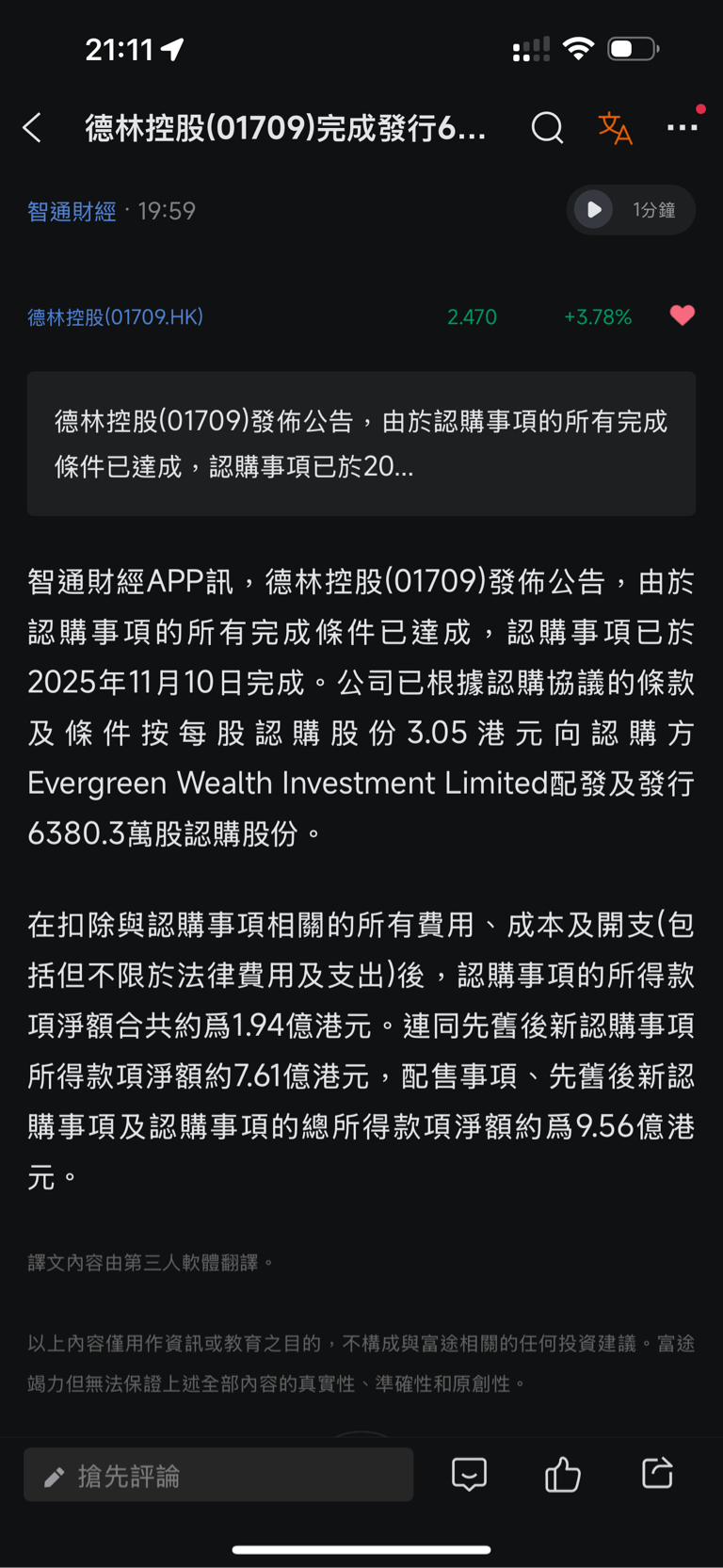 $德林控股(HK|01709)$ 配售完成公告出了,新股发到位了,快十亿钱也融到位了,是不是可以轮到牌照了?在2.5位置不宜久留,明天能不能冲上去,稳固升势#股市怎么看#