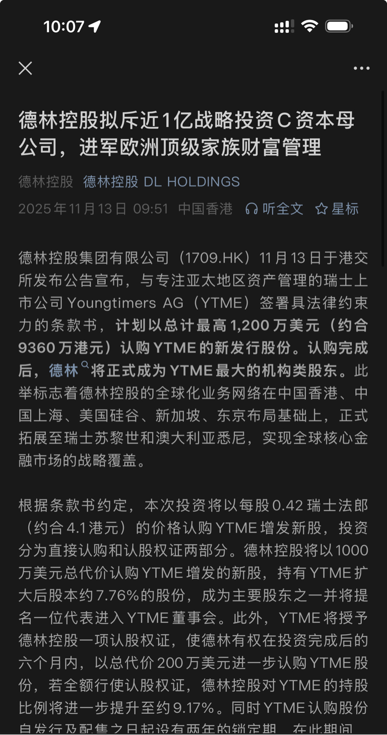 通过本次交易,德林控股将正式进军欧洲顶级家族财富管理领域,持续夯实其家族办公室业务的核心竞争力。#强势机会#