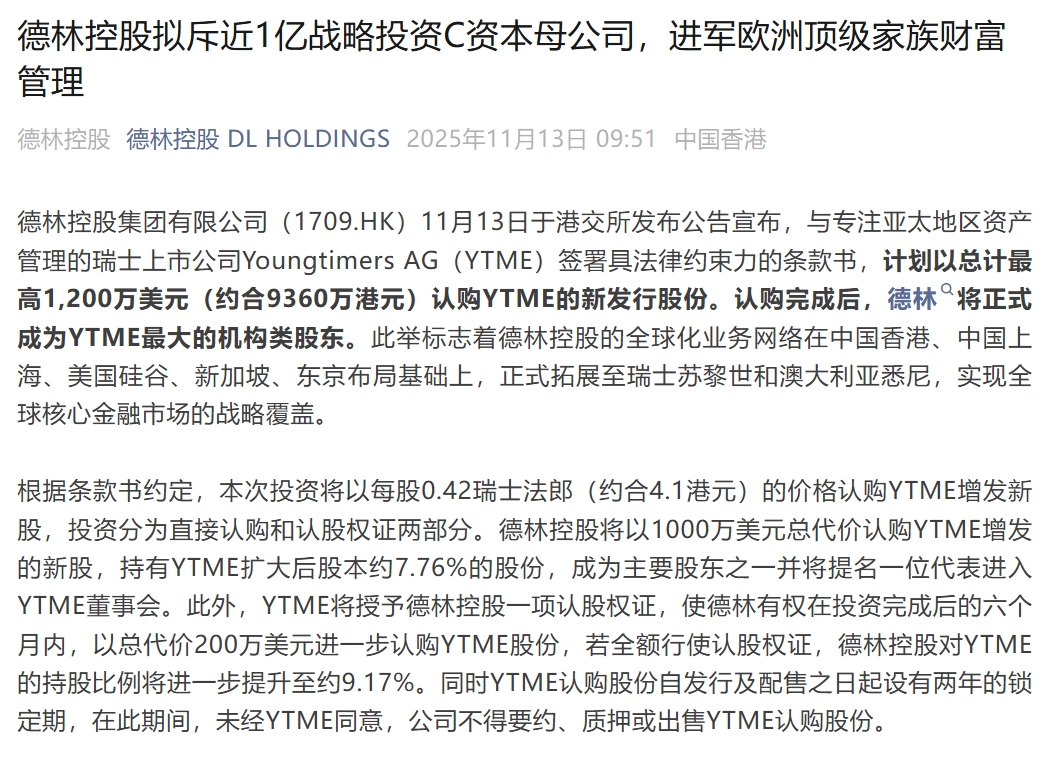 $德林控股(HK|01709)$ 德林控股拟斥近1亿战略投资C资本母公司,进军欧洲顶级家族财富管理