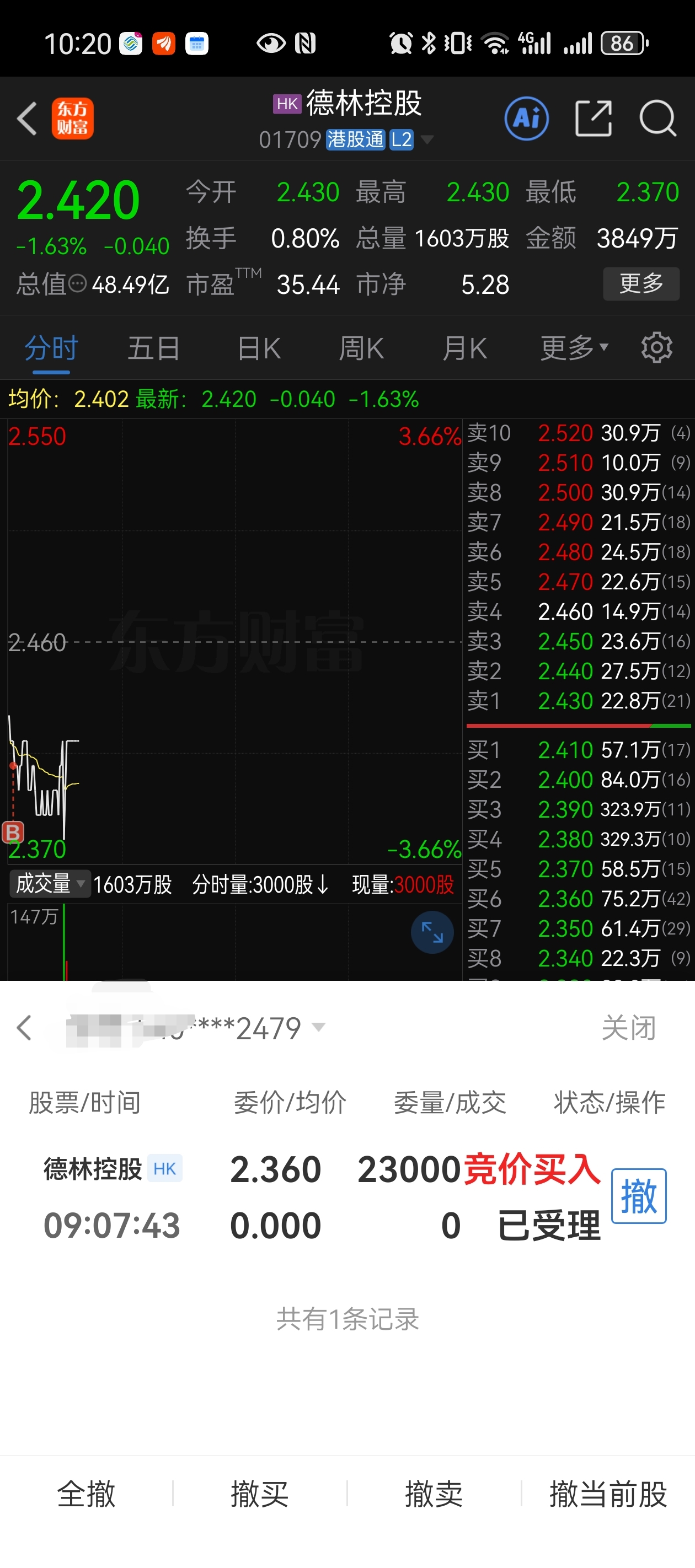 $德林控股(HK|01709)$ 一早挂了两个单,241的成了,希望236的别成