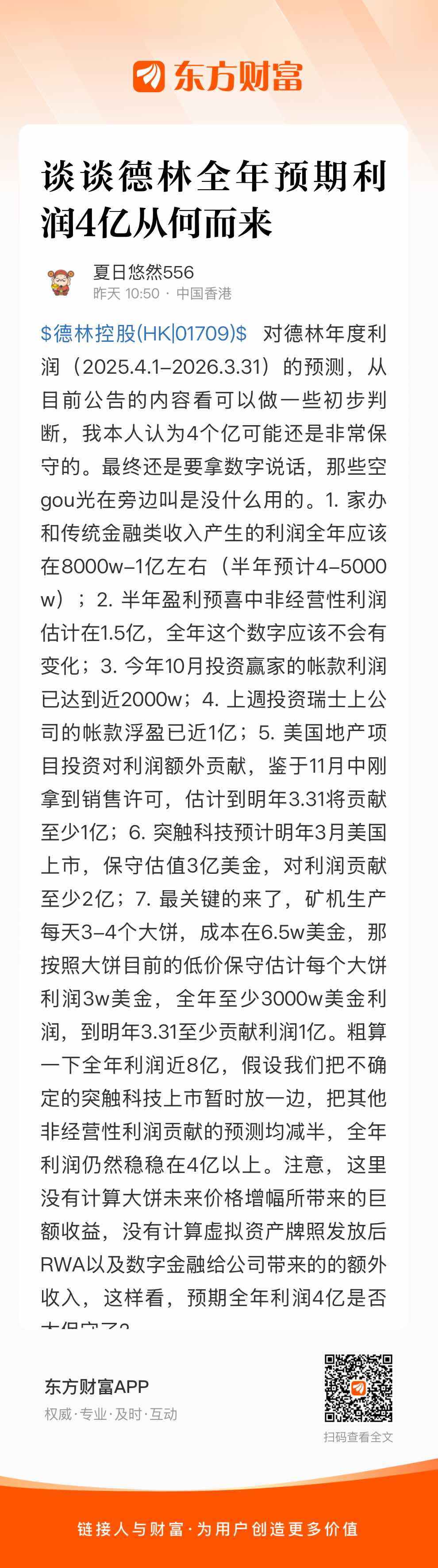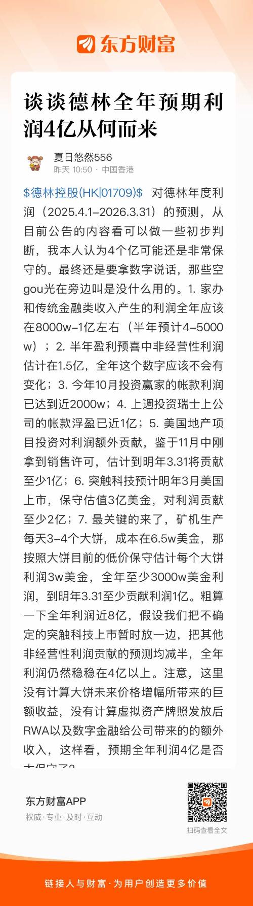 $德林控股(HK|01709)$ 对德林年度利润(2025.4.1-2026.3.31)的预测,从目前公告的内容看可以做一些初步判断,我本人认为4个亿可能还是非常保守的。最终还是要拿数字说话,那些空gou光在旁边叫是没什么用的。1. 家办和传统金融类收入产生的利润全年应该在8000w-1亿左右(半年预计4-5000w);2. 半年盈利预喜中非经营性利润估计在1.5亿,全年这个数字应该不会有变化;3. 今年10月投资赢家的帐款利润已达到近2000w;4. 上週投资瑞士上公司的帐款浮盈已近1亿;5. 美国地产项目投资对利润额外贡献,鉴于11月中刚拿到销售许可,估计到明年3.31将贡献至少1亿;6. 突触科技预计明年3月美国上市,保守估值3亿美金,对利润贡献至少2亿;7. 最关键的来了,矿机生产每天3-4个大饼,成本在6.5w美金,那按照大饼目前的低价保守估计每个大饼利润3w美金,全年至少3000w美金利润,到明年3.31至少贡献利润1亿。粗算一下全年利润近8亿,假设我们把不确定的突触科技上市暂时放一边,把其他非经营性利润贡献的预测均减半,全年利润仍然稳稳在4亿以上。注意,这里没有计算大饼未来价格增幅所带来的巨额收益,没有计算虚拟资产牌照发放后RWA以及数字金融给公司带来的的额外收入,这样看,预期全年利润4亿是否太保守了?