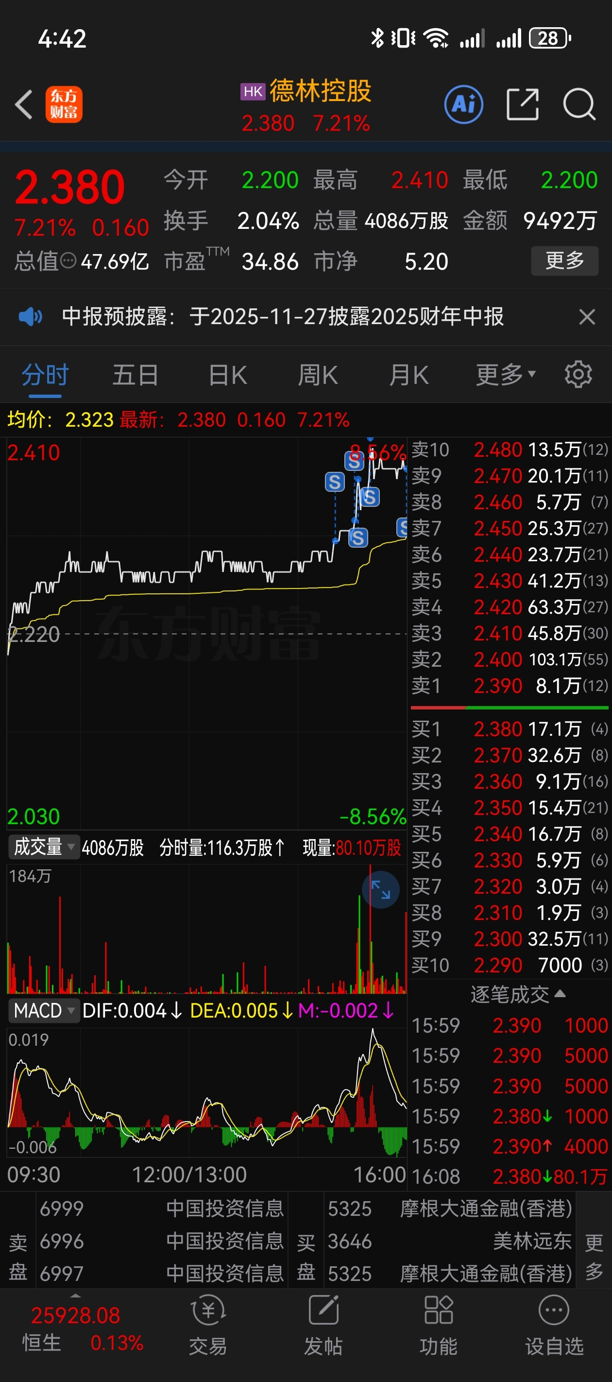 $德林控股(HK|01709)$ 减仓,今天没给机会加仓我就减点,希望明天给个机会让我再加回来。主力够狠就让我卖飞吧!