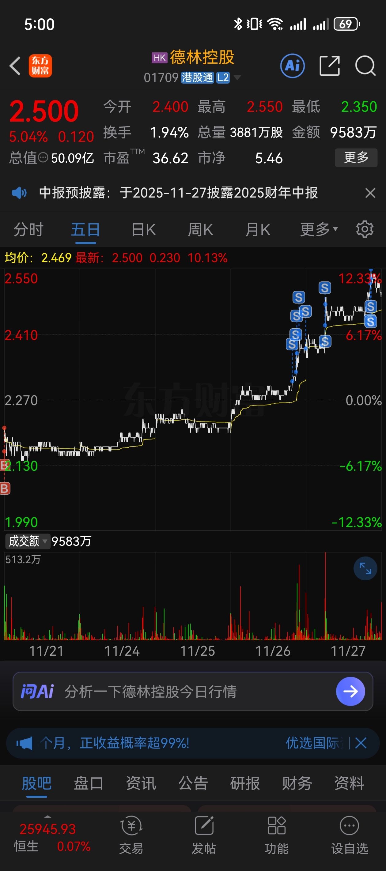 $德林控股(HK|01709)$ 来个剧本,今天晚上出财报,明天高开低走阴跌到尾盘,洗清不坚定筹码。等明天收盘后再出个爆炸性利好,后天直接不给上车机会!