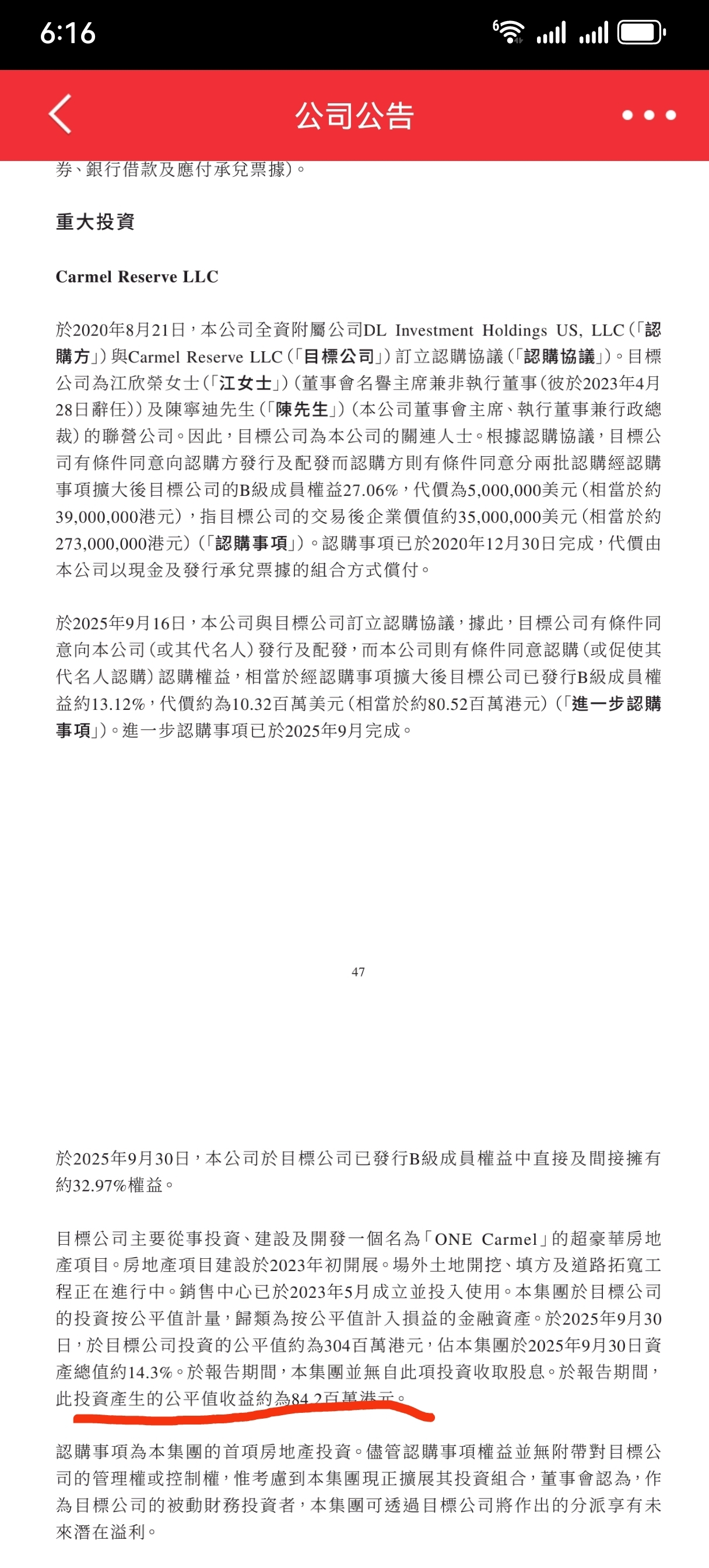 看了公告,主要的利润来源是,其他收益1.94亿元,大概有三部分组成,一部分是金融资产增值约7000万元,一部分是联营公司增值约1.14亿元,投资物业增值800万元。看来大头是联营公司的增值部分,其中主要是:1,美国的房地产项目,估值增加的收益是8千多万,2,德林家族办公室公司估值2亿多元,增值金额公告没有披露,估计是3千多万。两者加起来产生利润1亿多元。这两家公司实际都是德林自己控制的,怎么估值还不是看自己心情吗?这样产生的利润,有多大的含金量呢?
