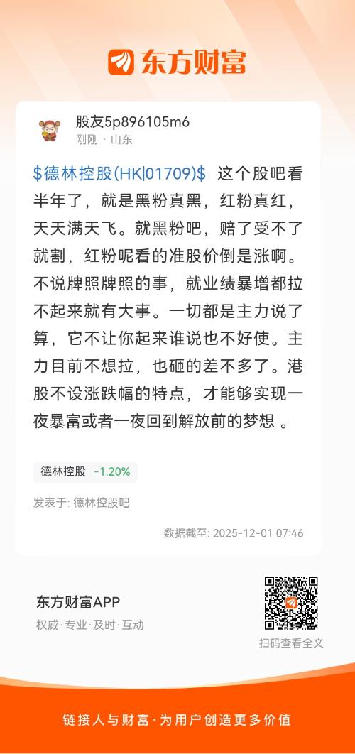 $德林控股(HK|01709)$ 这个股吧看半年了,就是黑粉真黑,红粉真红,天天满天飞。就黑粉吧,赔了受不了就割,红粉呢看的准股价倒是涨啊。不说牌照牌照的事,就业绩暴增都拉不起来就有大事。一切都是主力说了算,它不让你起来谁说也不好使。主力目前不想拉,也砸的差不多了。港股不设涨跌幅的特点,才能够实现一夜暴富或者一夜回到解放前的梦想 。