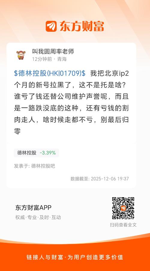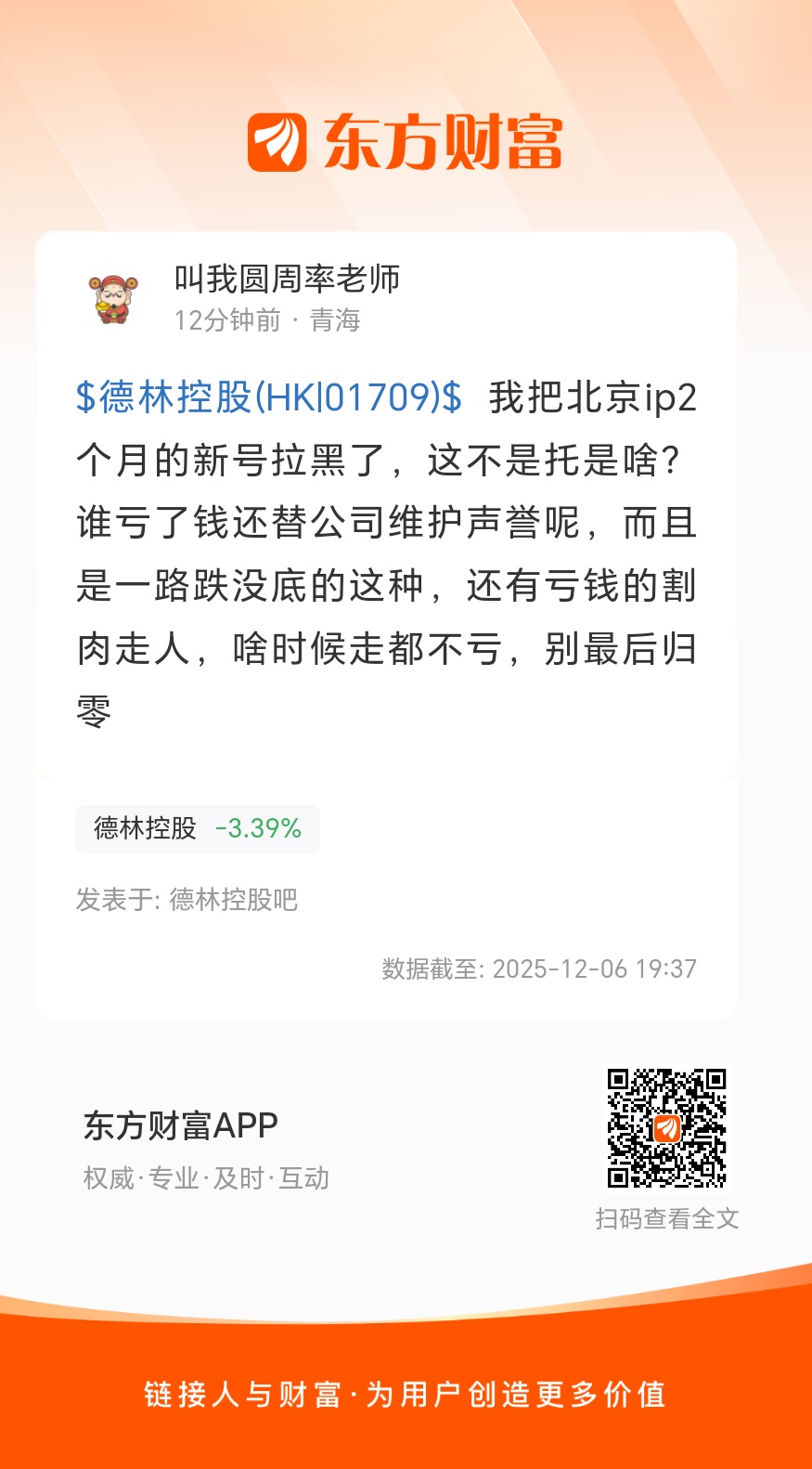 $德林控股(HK|01709)$ 我把北京ip2个月的新号拉黑了,这不是托是啥?谁亏了钱还替公司维护声誉呢,而且是一路跌没底的这种,还有亏钱的割肉走人,啥时候走都不亏,别最后归零