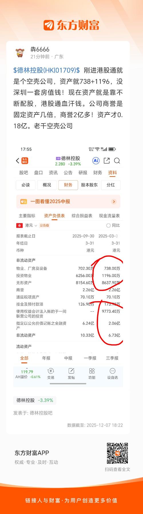 $德林控股(HK|01709)$ 刚进港股通就是个空壳公司,资产就738+1196,没深圳一套房值钱!现在资产就是靠不断配股,港股通血汗钱。公司商誉是固定资产几倍,商誉2亿多!资产才0.18亿。老千空壳公司
