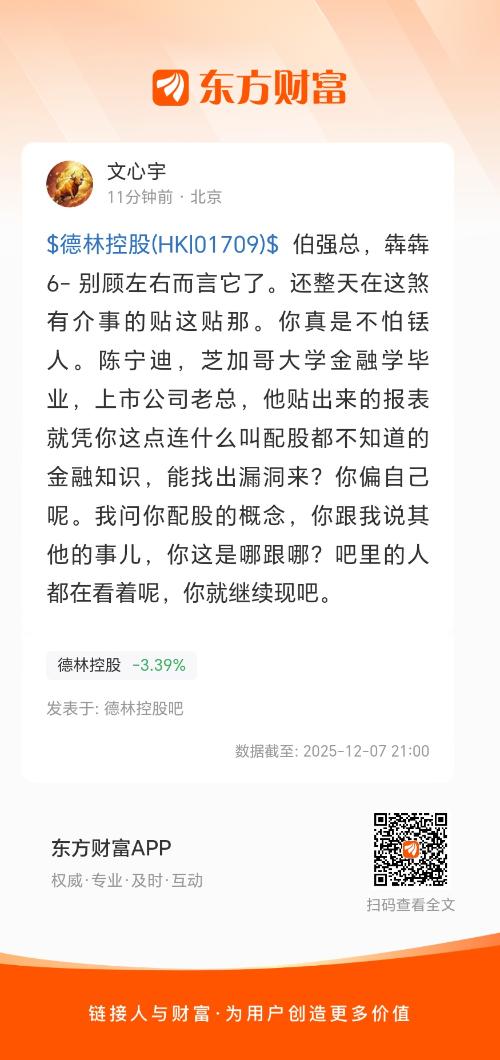 $德林控股(HK|01709)$ 伯强总,犇犇6- 别顾左右而言它了。还整天在这煞有介事的贴这贴那。你真是不怕铥人。陈宁迪,芝加哥大学金融学毕业,上市公司老总,他贴出来的报表就凭你这点连什么叫配股都不知道的金融知识,能找出漏洞来?你偏自己呢。我问你配股的概念,你跟我说其他的事儿,你这是哪跟哪?吧里的人都在看着呢,你就继续现吧。