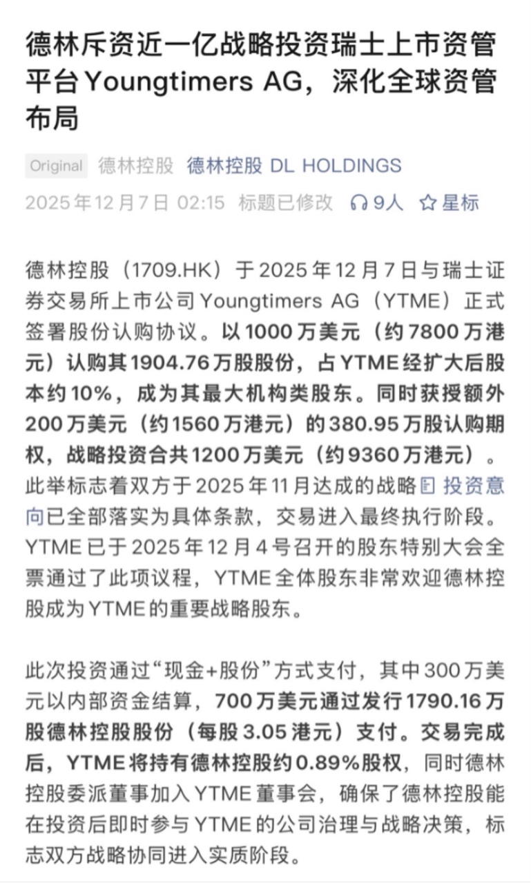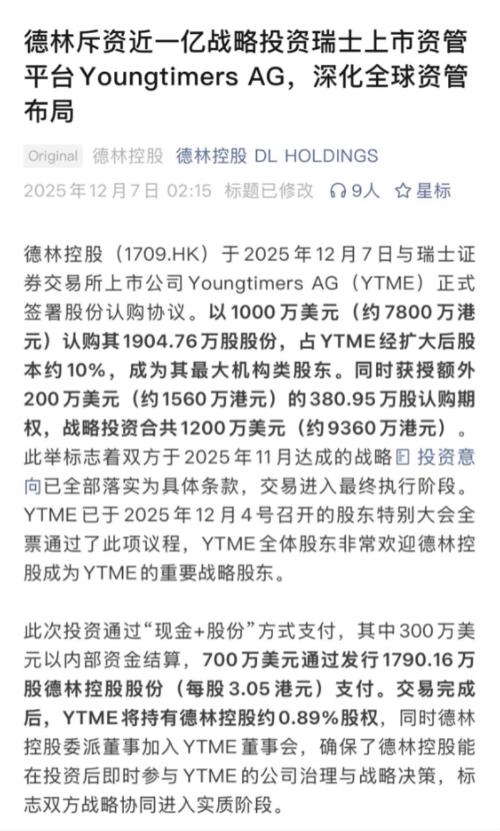 $德林控股(HK|01709)$ 瑞典这家公司Youngtimers总市值折合人民币3亿左右,然后用1亿左右去认购10%股权???你告诉我这是赚呢