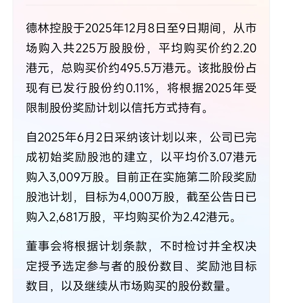 $德林控股(HK|01709)$ 大概还要回购六次,想想都可怕,回购一次跌一次,别人回购大涨,它们回购总是跌跌跌,奇了怪了,,,