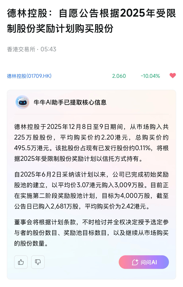 $德林控股(HK|01709)$ 德林回购第一批3000w股均价3.07,第二批4000w股中2700w股均价2.42,远高于目前价格。还有1300多万股回购额度,估计月底用完后还会启动新的一批3000w股回购计划。明天股价应该会反弹