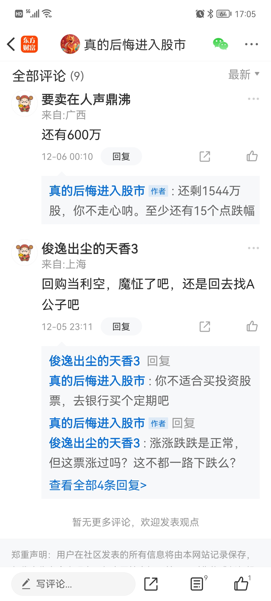 那些怼我的人,服了没有?12.5号就说回购只是为了出货,我说至少15个点跌幅,唯一不准是,到今天刚好-20个点