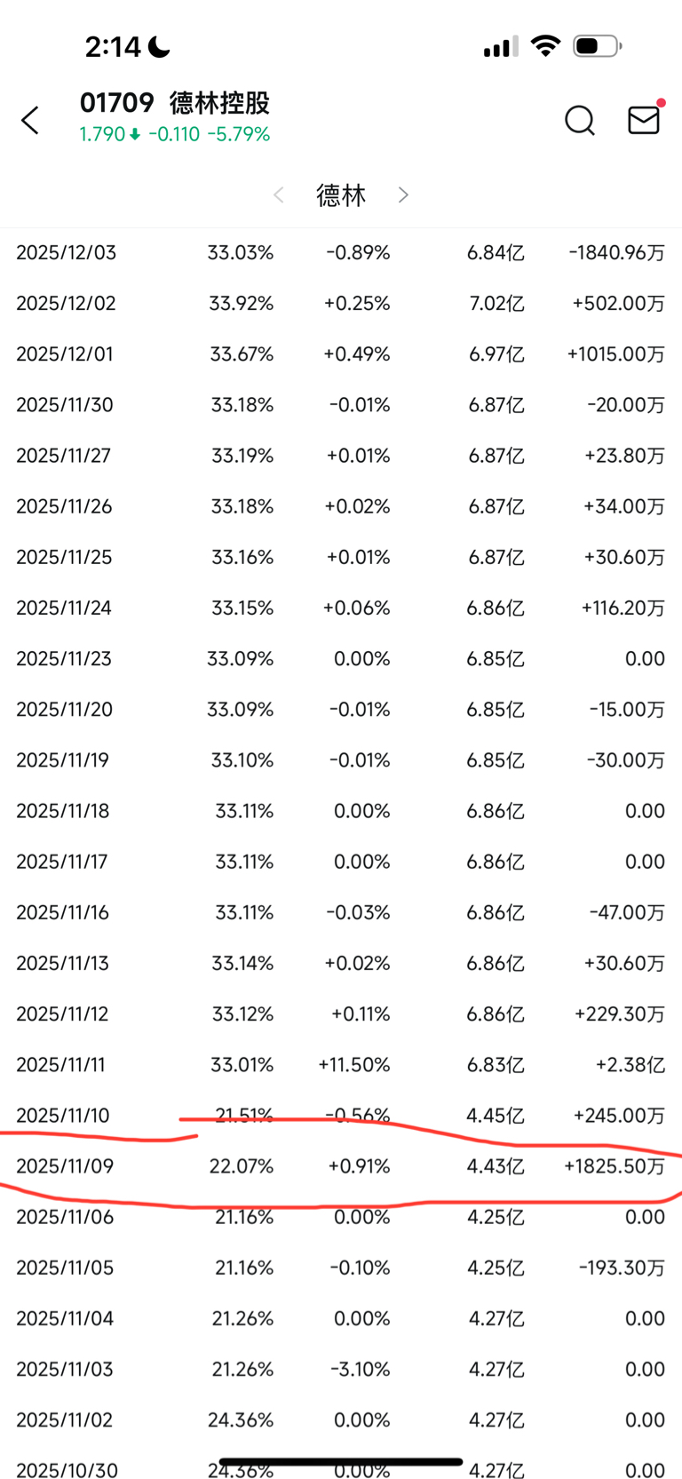 $德林控股(HK|01709)$ 大家都在问为什么12/3日德林证券一天仓位减少1800w股?12/1-2日德林公司从市场回购了1500w股,为何德林证券仓位在后一天又减少1800w股呢?很多人怀疑德林证券的配股投资人一天内出货或者是德林公司出老千。其实看一下CCASS的变化就清楚了,德林证券于11/9日多了1800w股,12/3日减少了1800w股。德林目前总共有20.7亿股,其中19.7亿股是电子股票,纸股票有9600w股,而在12/3日之前,纸质股票是7800w股,所以结论也很简单,11/9日匯入德林证券的1800w股在12/3日以纸股票的形式被提出。时间可以证明一切,希望这个可以解答大家的疑问。