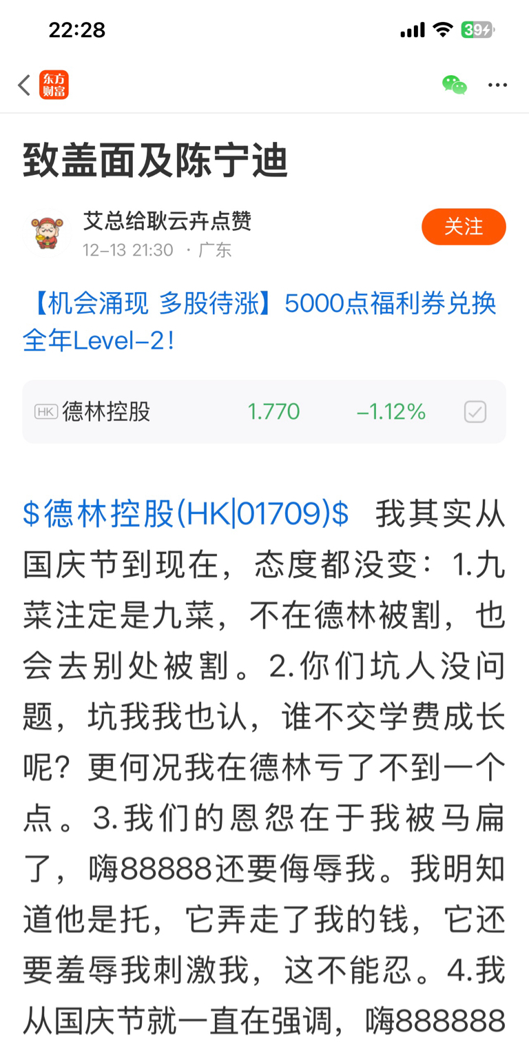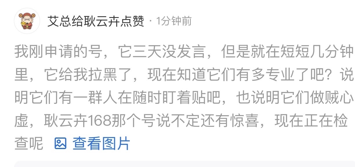 $德林控股(HK|01709)$ @月瞎,别拉黑我啊(我还主动关注你)。你看看,多委屈啊,三天都盯着别人说没说话,是不是三天没吃饭盯着,手抖着写下两篇致敬小作文,问题还致敬你的迪人,我致敬翻倍兄,是因为我们是难友,你手抖着致敬你的敌人是什么个道行——多大的仇啊,这么放不下?