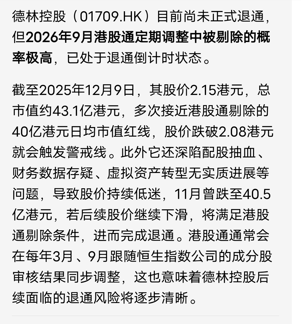 $德林控股(HK|01709)$ 退通的风险是相当的大