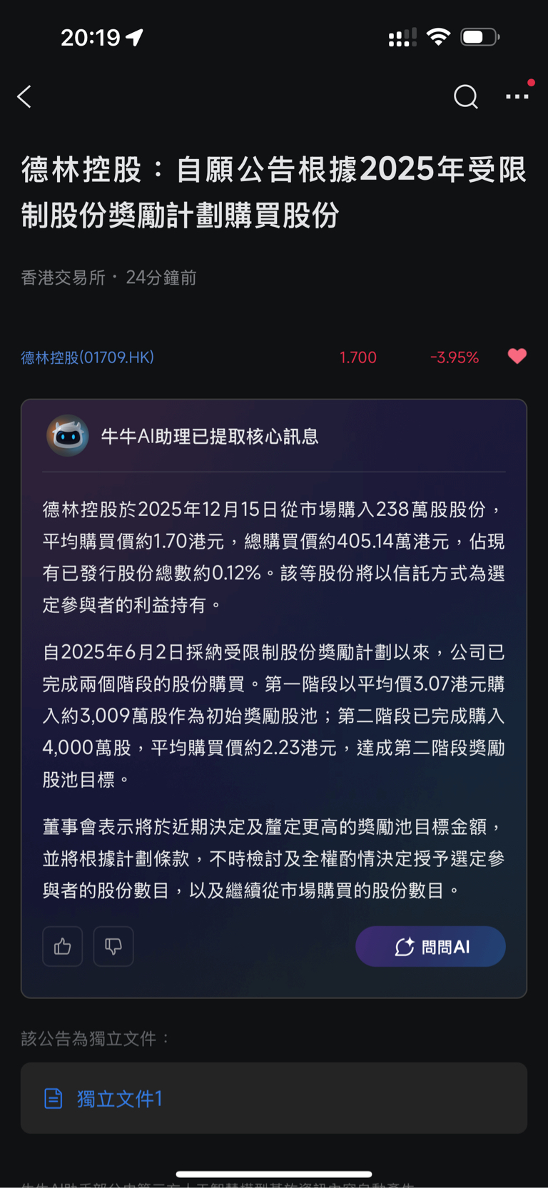 $德林控股(HK|01709)$ 翻译一下就是7009万股已经从市场买完了,但既然越买越低,那就继续加大份额继续买。看得出他德林想要筹码不要钱,而这档口正好做空机构做空,唱空团队吓我们散户割肉。。。自己想吧,我票反正不给他,有种做空唱空到1块我跟德林一起捡货!谁怕谁