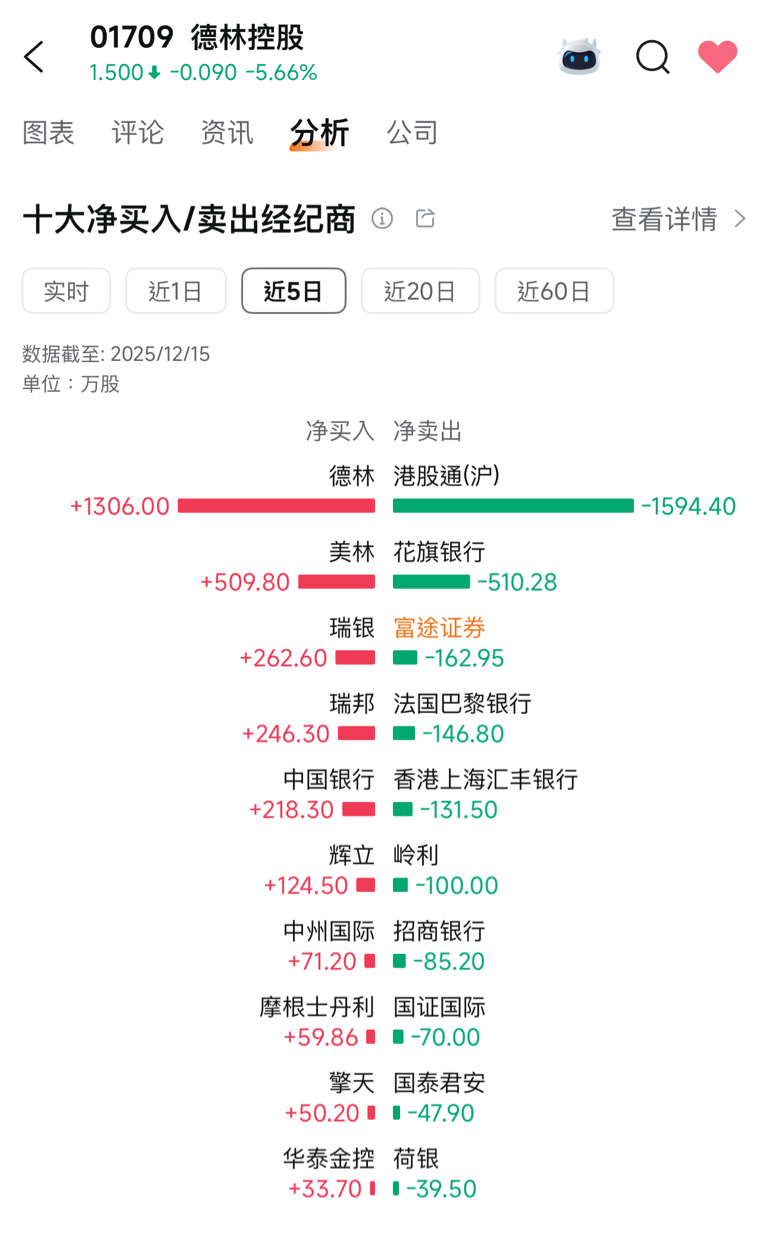 $德林控股(HK|01709)$ 德林最近不断加仓也能说明很多问题,之前外资配股的估计现在走的差不多了,可能剩下的对沖和量化每天都在打压股价低抛然后更低位收,国内港股通的量化可能也在做同样事,将持有成本降到最低(这也解释了每天成交量过亿的原因)所以到一定阶段只要股价开始反弹,这些资金又会大量买入。相信公司长线持有的(或者是套住被动长期持有的),可以耐心关注,适当时可以选择补仓。只想短线持有但又不想冒风险的建议止损离场,或者暂时不要进场,多空还在博弈。把唱空唱多的那些阴谋论放一边,理性的思考一下德林最近的公告,不难看出公司是在想尽一切办法来支撑股价,市场暂时性不买单也是因为大环境和资金暂时性离场的原因。股价如果还要跌,公司可以让股价跌到底再回购,大股东也没必要现在入场,入场后还继续锁仓,这一系列动作背后的逻辑都是为了给市场树立信心,支撑股价。接下来,牌照是德林躲不开的问题,相信牌照下来,很多阴谋论也不攻自破,短期不断低抛低吸的量化资金盘也会加速回补。弹簧是否已经压到最低,大家拭目以待。