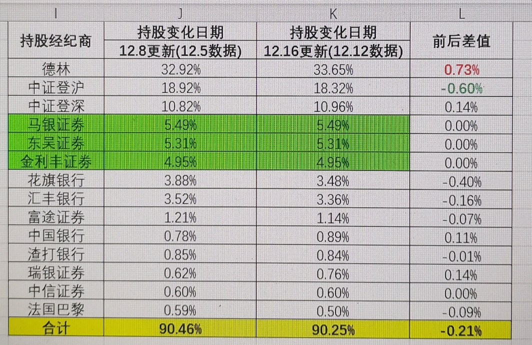 $德林控股(HK|01709)$ 同花顺的昨天更新数据,作妖的隐藏的很深。绿底色的那几个是德林的转仓账户,根本没动过。