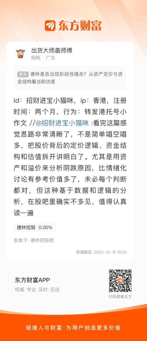 id:招财进宝小猫咪,ip:香港,注册时间:两个月,行为:转发港托号小作文 //@招财进宝小猫咪 :看完这篇感觉思路非常清晰了,不是简单唱空唱多,把股价背后的定价逻辑、资金结构和估值拆开讲明白了。尤其是用资产和溢价来分析阴跌原因,比情绪化讨论有参考价值多了,未必每个判断都对,但这种基于数据和逻辑的分析,在股吧里确实不多见,值得认真读一遍