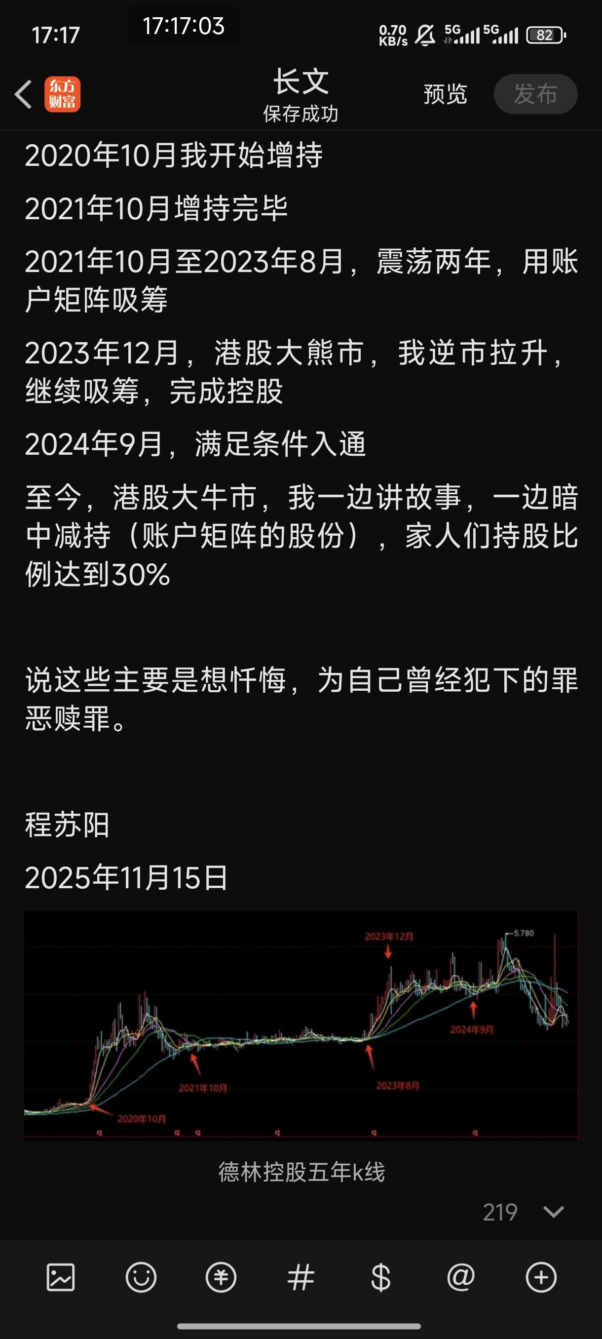//@出货大师盖师傅 :我还是得回应你,尽管回了很多次:港股通买入30%,德林锁仓42%,股价跌了75%,谁在卖?能在港股通买入30%筹码背景下把股价砸掉大半,对方必然有远超30%的筹码,这种筹码量根本不是1%不到做空能做到的,所以,1.德林几年前拉升时,迪迪的账户矩阵买入的筹码。2.两次配售的迪迪关联方。入港股通前,你以为迪迪占股42%,其实他占股90%+,锁仓是障眼法,真实操作是卖公司给港股通,它们保守还有20%筹码...