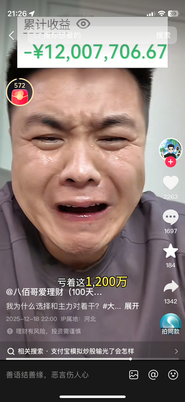 这哥们又亏了200万了,上次1000万,现在1200万……