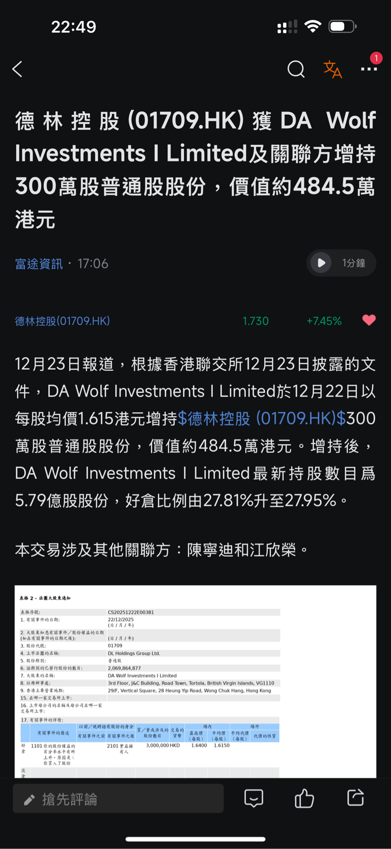 $德林控股(HK|01709)$ 陈宁迪两夫妇在1.53和1.61不停增持,别的什么哪有老千会回购会增持这种话就不说了,我就想问问哪些不坚定的把肉割在了那些位置?都那么喜欢被唱空团队带节奏?