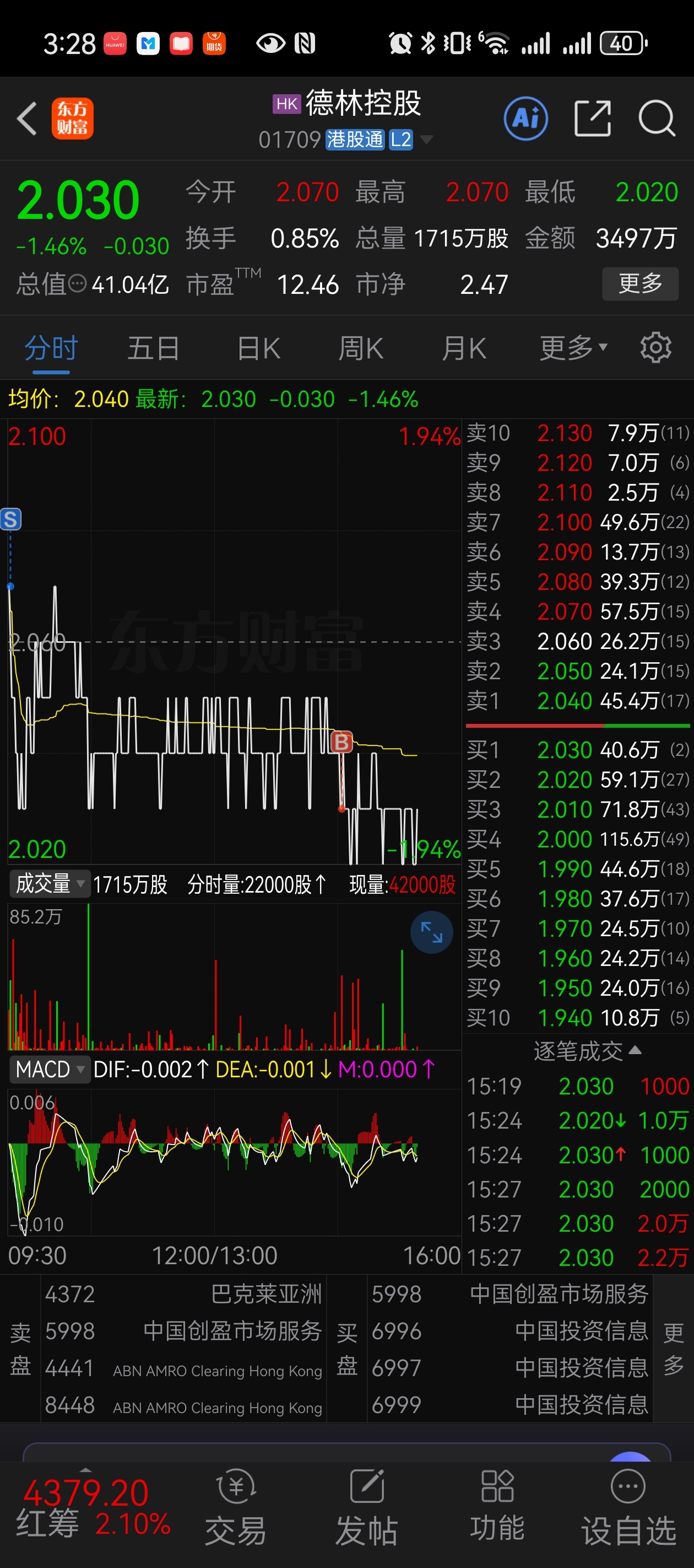 $德林控股(HK|01709)$ 开盘挂卖2万股,结果只成了6千股,但还是又接回来了,就是爱炒来炒去,没办法