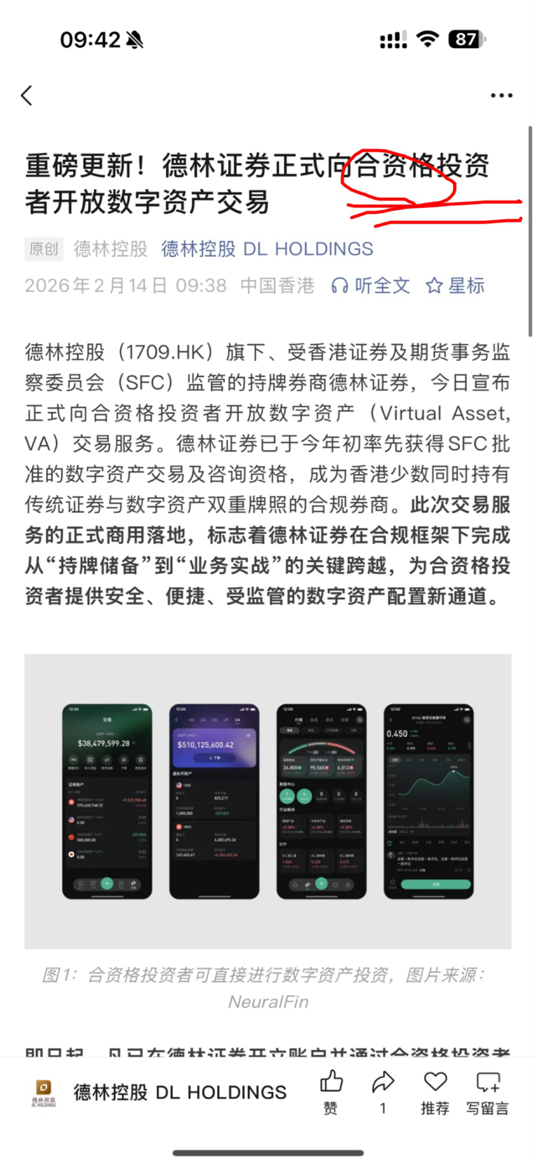$德林控股(HK|01709)$ 看见了吗?又开始片了!你们要仔细看他的文章文字!这些字眼学问太多了!合资格的投资者,就不是散户,另外没人用他的交易平台,用osl hashkey都是正规平台,最次也用富途;所以这次的大饼你们看着吃!