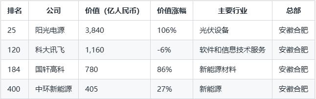 2025胡润中国500强出炉:合肥4家企业再度上榜 阳光电源、科大讯飞、国轩高科、中环新能源……