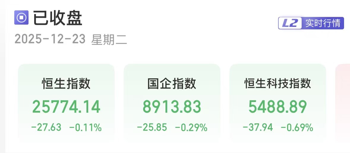 上证报中国证券网讯(刘禹希记者严晓菲)12月23日,港股三大指数收跌。截至收盘,恒生指数跌0.11%,报25774.14点;恒生国企指数跌0.29%,报8913.83点;恒生科技指数跌0.69%,报5488.89点。
