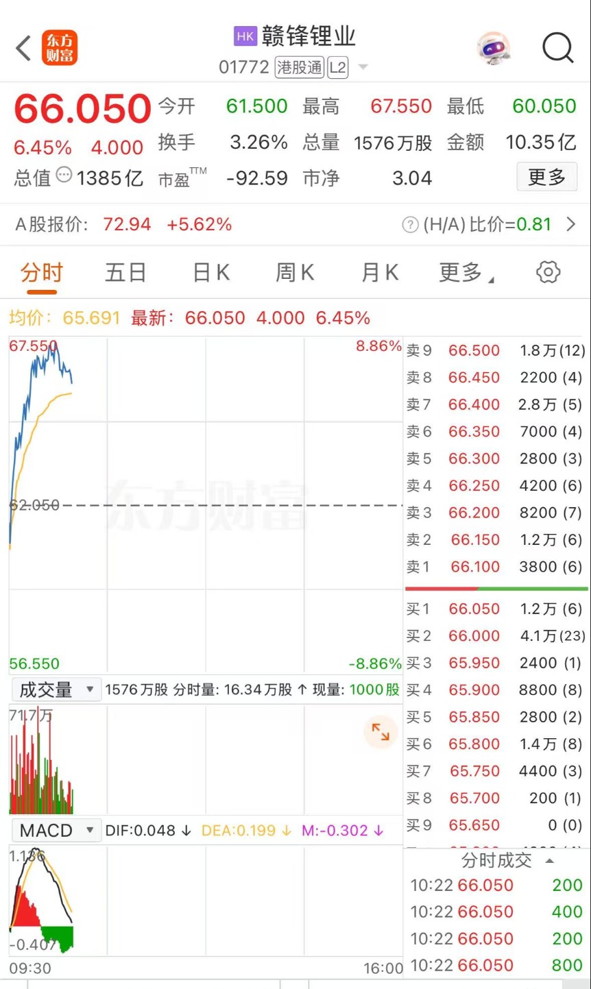 上证报中国证券网讯1月15日,港股锂电股持续拉升,其中,赣锋锂业一度涨超8%,天齐锂业一度涨超6%;截至10时22分,赣锋锂业涨6.45%,报66.05港元/股,天齐锂业涨4.68%,报57.05港元/股。A股方面,赣锋锂业一度涨近7%,天齐锂业一度涨近5%。