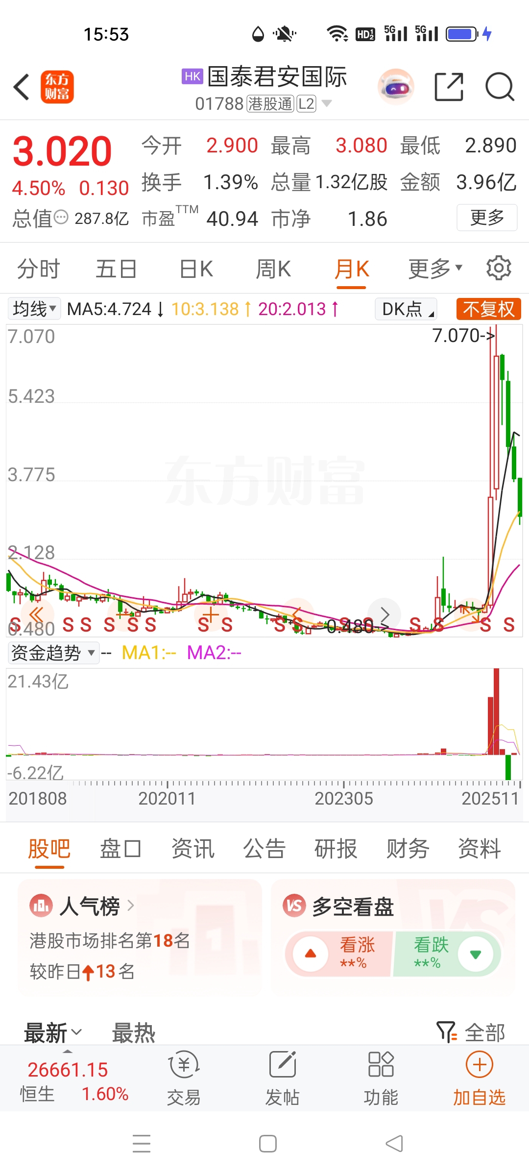 $国泰君安国际(HK|01788)$ 上不去,先出大部分,0.48上来的,大概率回到2块6左右!