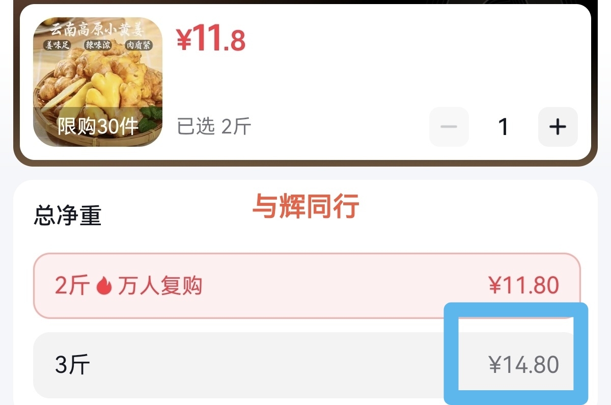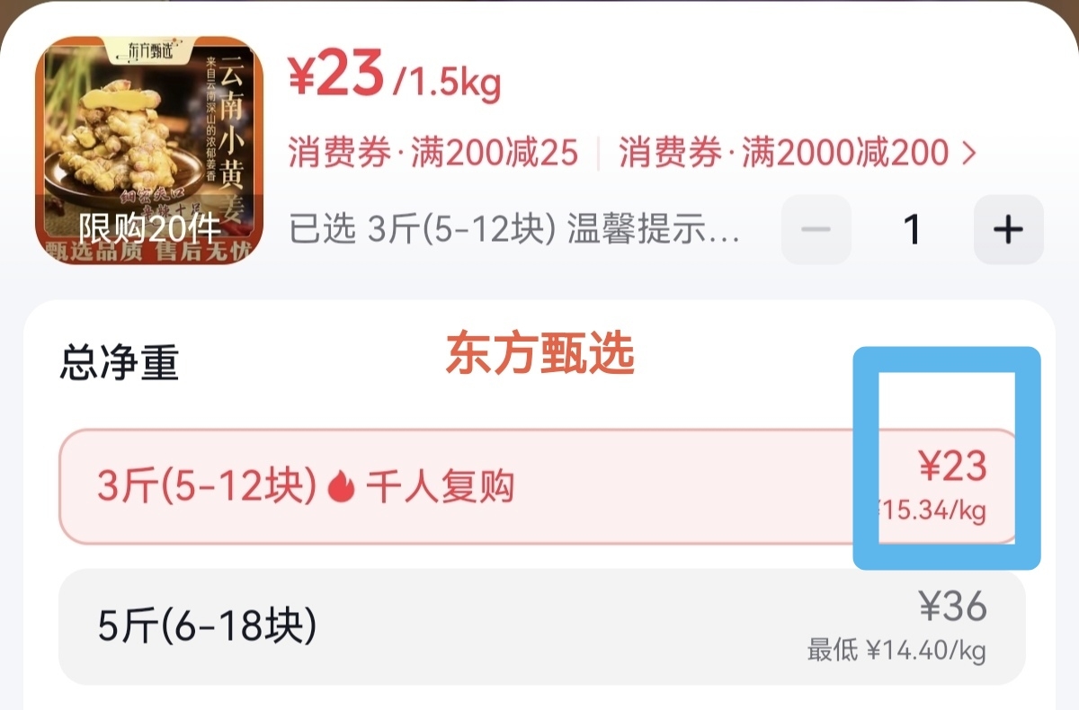 云南小黄姜,都是昆明发货,东方甄选无抽检报告,与辉同行5页抽检报告,价格对比