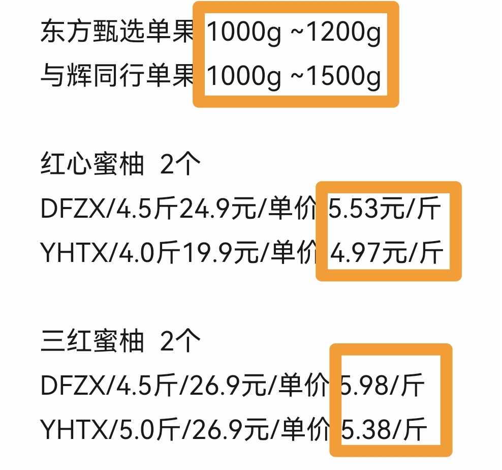 $东方甄选(HK|01797)$ 雪球有人在比红柚的价格,与辉同行提供非常清晰的5页(含主页)抽检报告,号称知名品牌的东方甄选只提供一张模糊图片,同等条件比较如下: