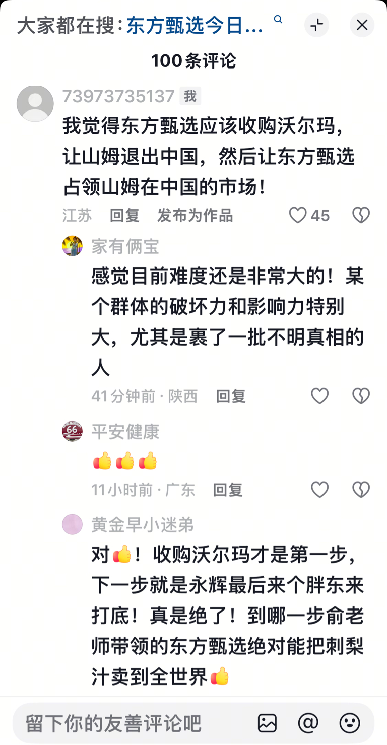 东方甄选的粉丝居然认为东方甄选收购沃尔玛是有难度的!沃尔玛市值6万亿,东方甄选市