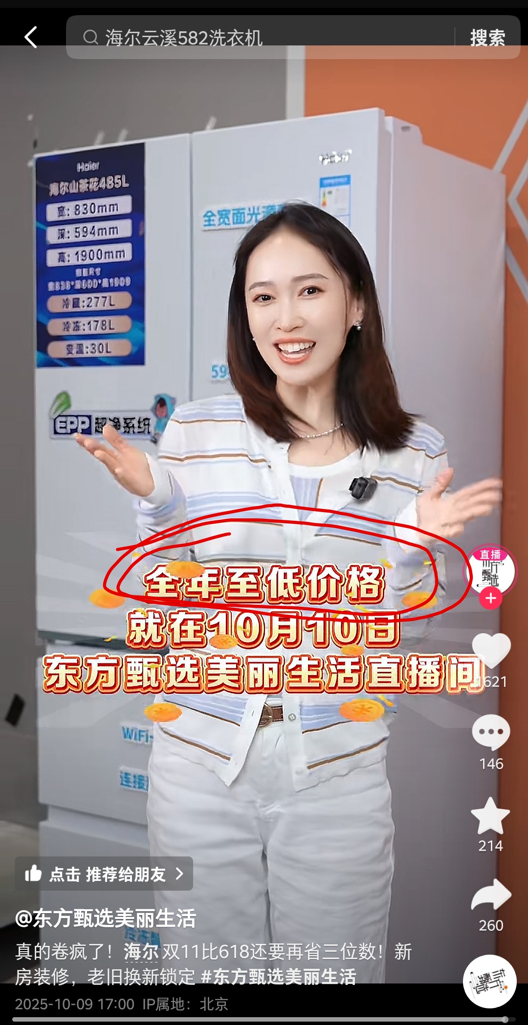 $东方甄选(HK|01797)$ 请问这位女主播为什么要公然撒谎欺骗消费者?明明都是来自同一个厂家,链接都是同一个。冰箱家一模一样。你为啥要说你们也给补贴了,还说你们直播间才是致低价!这么公然的骗人也可以吗?